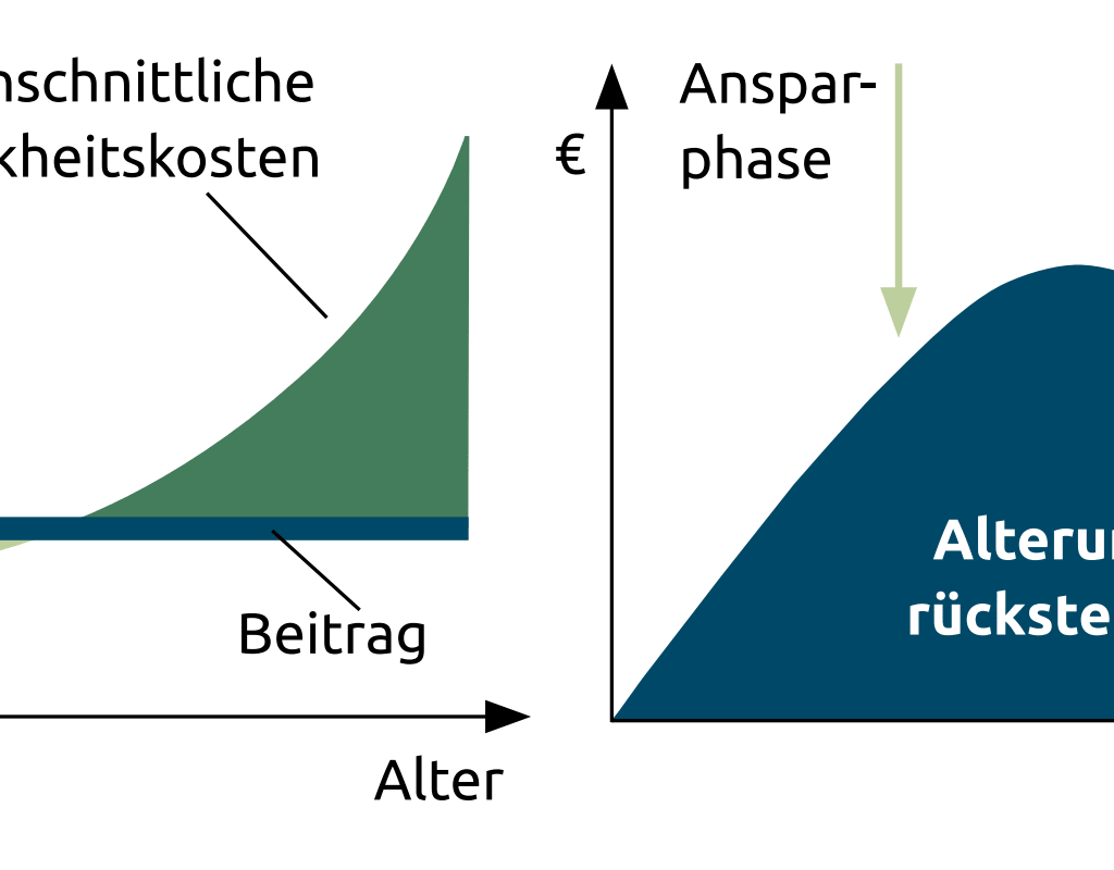 Mit zunehmendem Alter sind die anfallenden Leistungen höher als der zu entrichtende Beitrag. Die Differenz wird durch die aufgebauten Rückstellungen ausgeglichen.