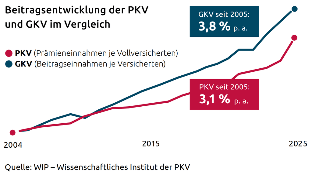 In einem aktuellen Beitragsvergleich mit der GKV schneidet die PKV sehr gut ab. Das Wissenschaftliche Institut der Privaten Krankenversicherung (WIP) hat in einer Studie berechnet, wie die Beitragseinnahmen pro Versicherten in den Jahren von 2005 bis 2025 gestiegen sind.
