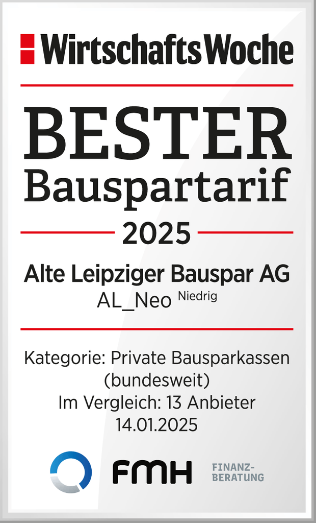 Dass unser Bauspartarif „AL_Neo“ hier Maßstäbe setzt, wurde nun erneut bestätigt: Nach der Top-Bewertung im Jahr 2024 zählt die Alte Leipziger Bauspar AG auch 2025 wieder zu den besten Anbietern am Markt – ausgezeichnet als BESTER Bauspartarif 2025 von der WirtschaftsWoche.
